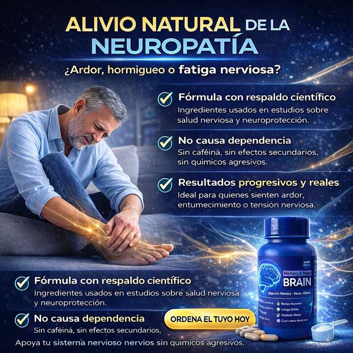 Fórmula basada en componentes naturales como vitaminas del complejo B y extractos herbales que apoyan la función cognitiva y el bienestar mental.